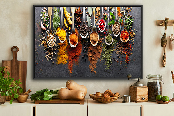 Um quadro grande para sala de jantar pode ser chamativo e elegante, enquanto um quadro para banheiro deve ser mais discreto.